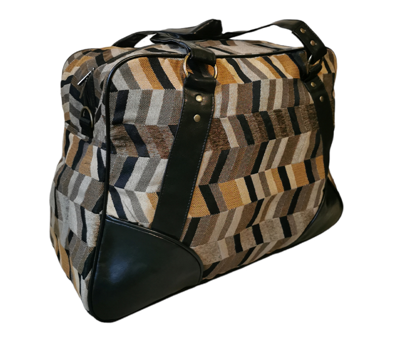 Bolso De Viaje estampa Otoño con hermosa textura y colores tierra, detalles de ganchos , argollas, carros, tachas de bronce envejecido un sutil pero elegante detalle que realza la belleza del bolso.