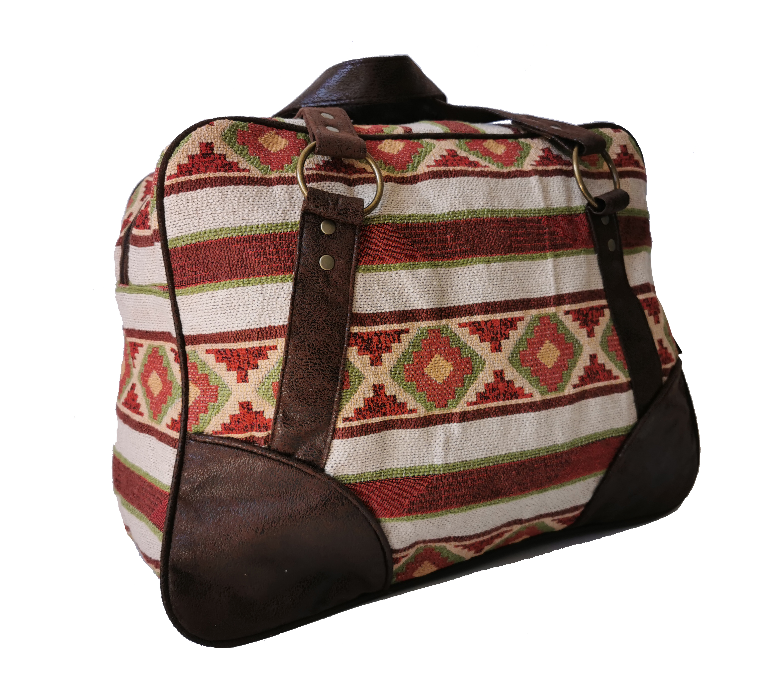 Bolso de viaje de tamaño mano material de tela y eco cuero de gran capacidad . En su interior de forro suave tiene un bolsillo con cierre y un compartimientos para guardas cosas. Posee dos manillas con argollas de bronce y una correa, ajustable.
