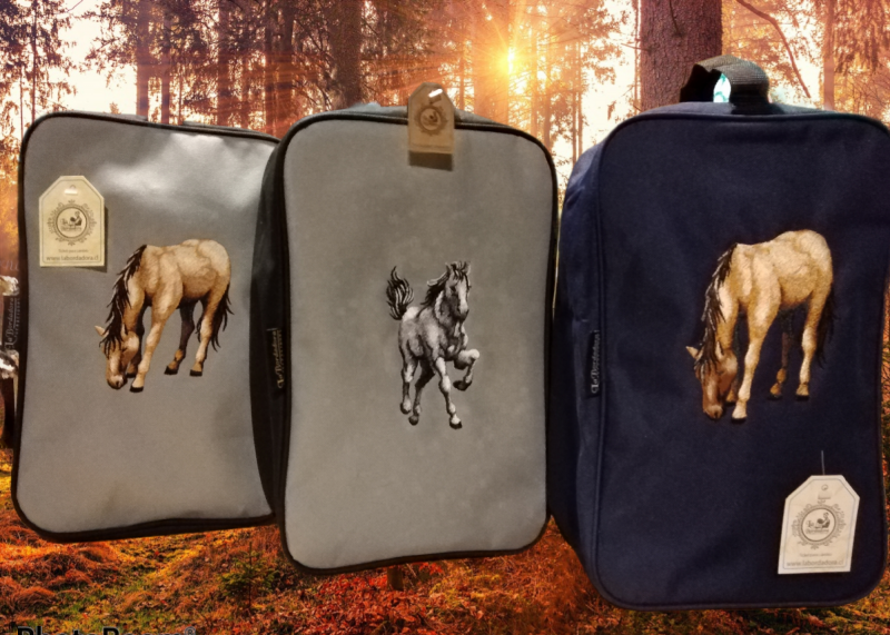 bolso zapatero de Medidas 32x20x10 de Tela de bolso con logo bordado  ,además  va con nombre incluido. Diseño  caballo. Sin embargo tambien sirve como bolso de viaje para la afeitadora y productos personales de aseo.