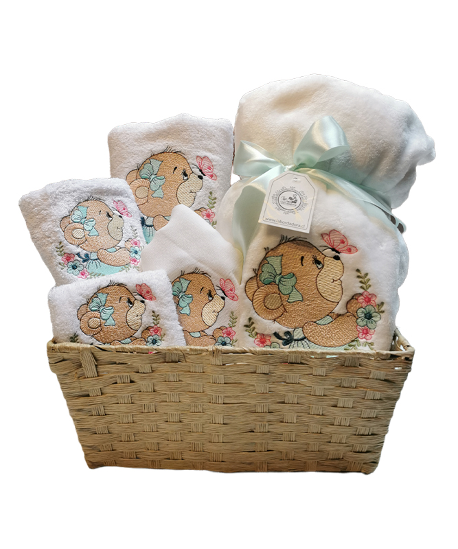Incluye una toalla de bebé y una toalla de mano, ambas bordadas con un nombre personalizado, lo que agrega un toque único y especial a tu cuidado personal.