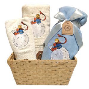 Toalla de baño y mano, babero y pañal tuto. Además todo personalizado con un nombre pequeño bordado. Cajita de madera y envoltura para regalo.