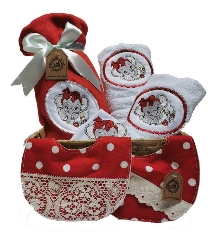 Canasto con Toalla de baño y mano color blanco bordado con diseño elefantita , Manta Roja de polar bordada con diseño elefantita y Baberos Rojos. Además trae bolsita de colación con diseño Bordado. Todo personalizado con un nombre pequeño bordado. Incluye Canasto y envoltura para regalo,  especial y delicado Regalo  por ejemplo para bebe o infante .