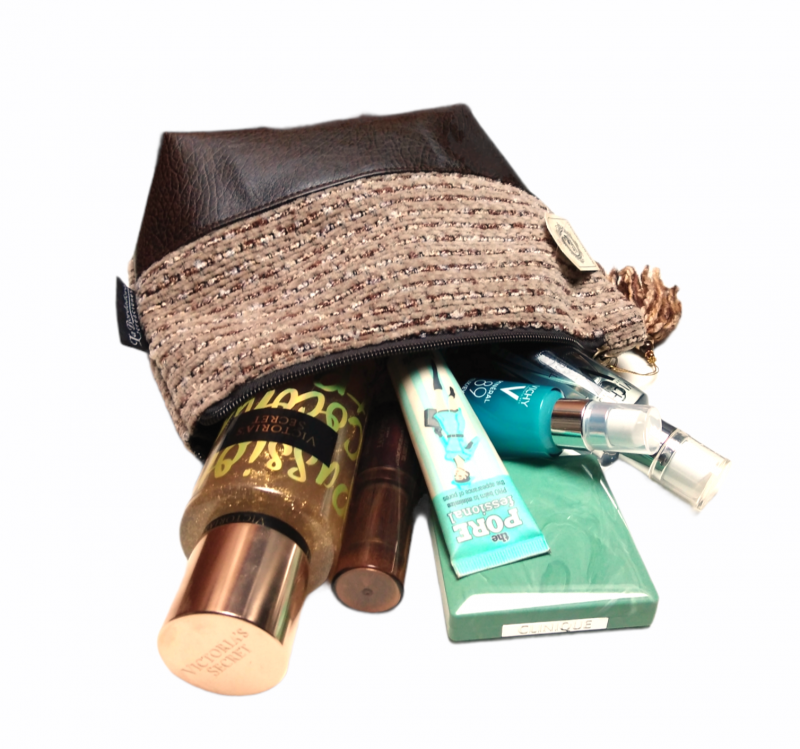 Cosmetiquero sus Medidas: 24,5 x 18 cm., carrito de bronce y chiche colgante con pedrería. material tela y eco cuero.