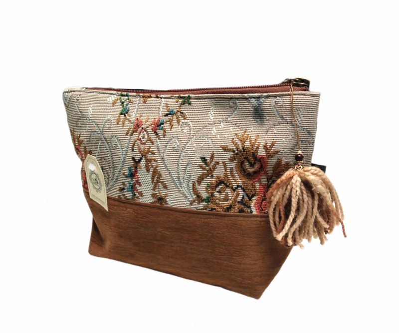 cosmetiquero sus Medidas: 24,5 x 18 cm., carrito de bronce y chiche colgante con pedrería. material tela y eco cuero