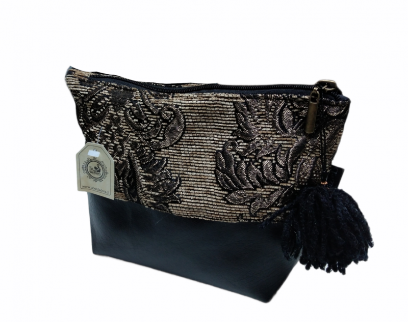 cosmetiquero sus Medidas: 24,5 x 18 cm., carrito de bronce y chiche colgante con pedrería. material tela y eco cuero