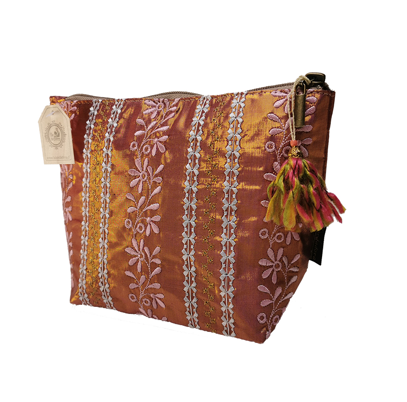 Cosmetiquero  sus Medidas: 24,5 x 18 cm., carrito de bronce y chiche colgante con pedrería. material tela y eco cuero. Además  esta forrado.