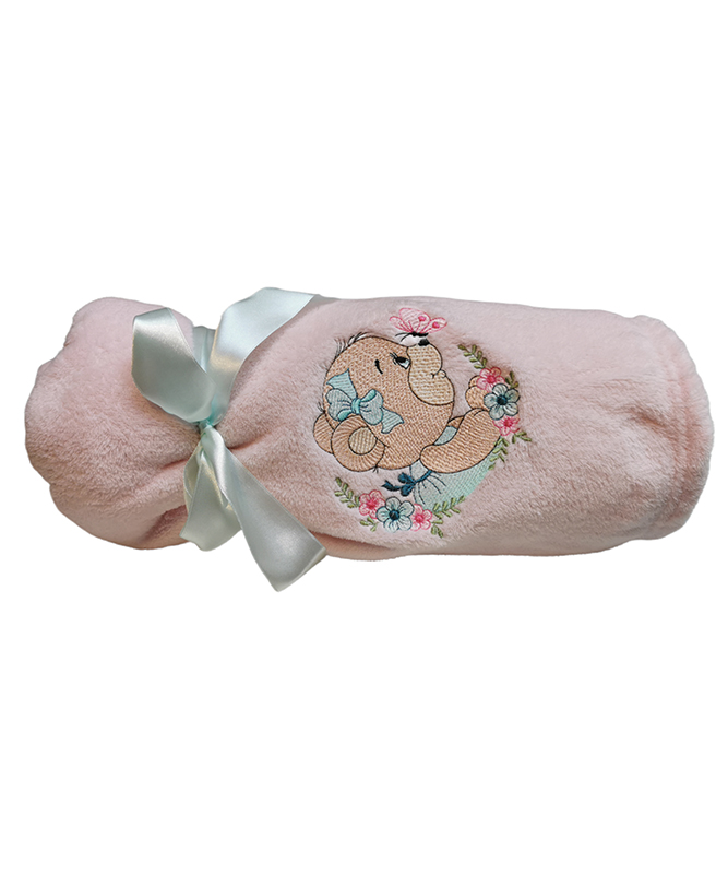 Manta de Piel Rosada diseño osita mariposa bordada, delicada y suave piel .Y sus medidas son de 125×150, incluye nombre pequeño bordado. Ideal para regalar en babyshower.