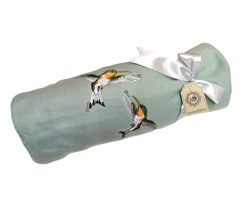 Manta de Polar Verde menta con Picaflores y nombre . Además las medidas son 125×150 cm, Hermoso y cálido regalo ideal para los momentos fríos .