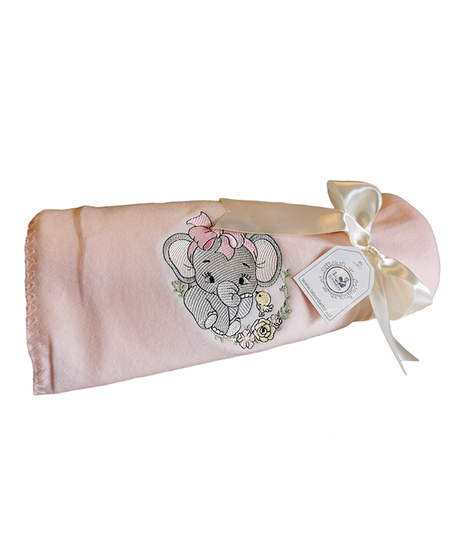 Manta polar rosada Elefanta bordada, ademas sus medidas 125×150 ,si incluye nombre pequeño bordado