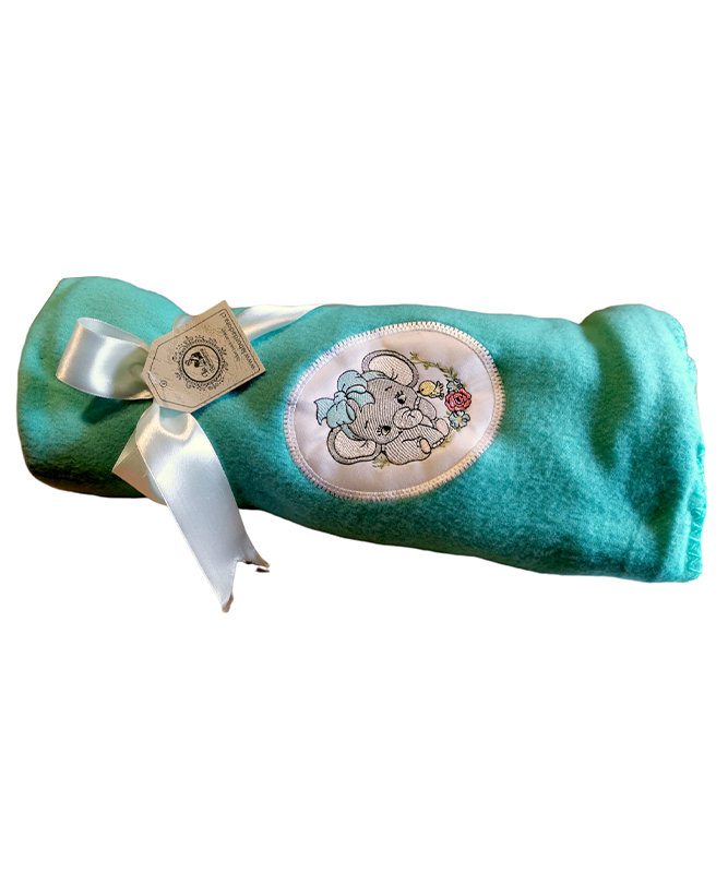 Manta Polar turquesa Elefanta diseño Bordado sus medidas 125×150 , incluye nombre bordado , Además Material principal: 100% Poliéster.
