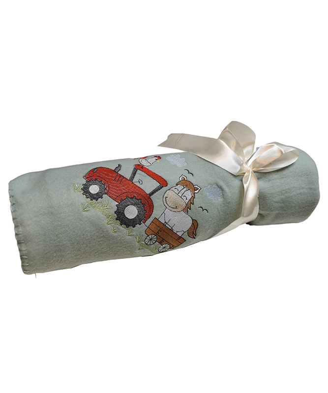 Manta polar verde granjero, sus medidas 125×150 , Si incluye nombre pequeño bordado