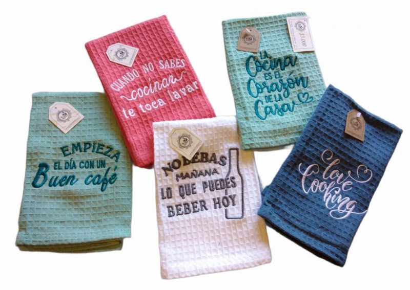 Paños de cocina con Leyendas bordadas, varios colores y diseños.