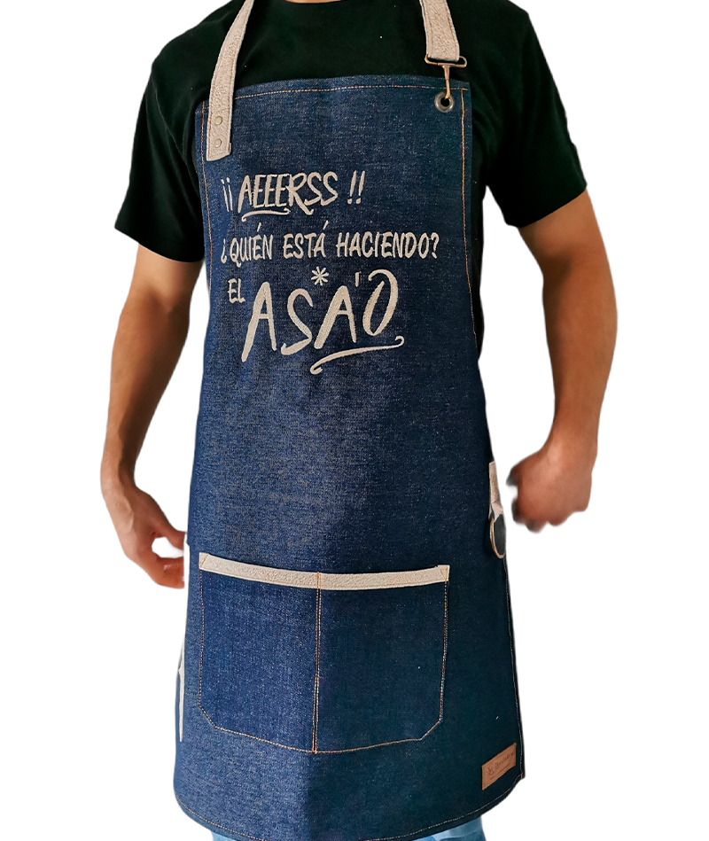 Pechera o delantal cocina y asado de mezclilla, pero con detalles en eco cuero y hebillas de bronce. Con costuras reforzadas. Y  tamaño único. Medidas de la pechera  Ancho : 62 cm mas tirantes y  Alto : 83 cm mas tirante. Tirante ajustable y con clip ,viene con 3 bolsillos 1 para el cuchillo, 2 para lo que quieras , además una argolla para colgar el astil o paño . Leyenda Grande Bordada con simpáticas y llamativas leyendas. Fabricación nacional.