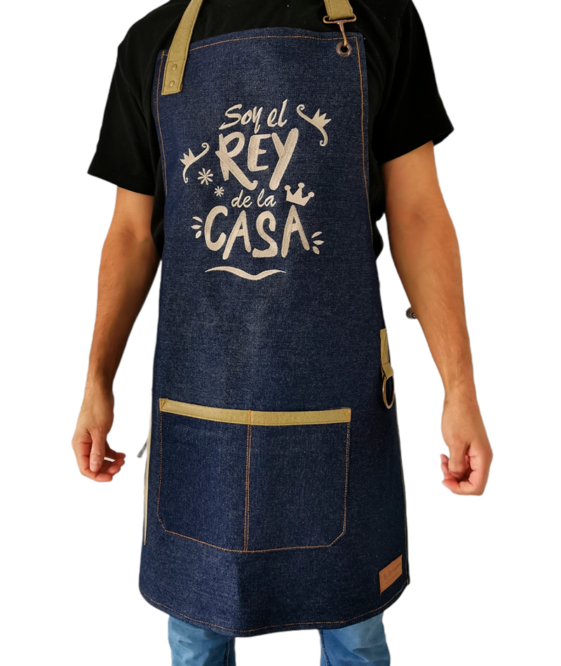 Pechera o delantal cocina y asado de mezclilla, pero con detalles en eco cuero y hebillas de bronce. Con costuras reforzadas. Y  tamaño único. Medidas de la pechera  Ancho : 62 cm mas tirantes y  Alto : 83 cm mas tirante. Tirante ajustable y con clip ,viene con 3 bolsillos 1 para el cuchillo, 2 para lo que quieras , además una argolla para colgar el astil o paño . Leyenda Grande Bordada con simpáticas y llamativas leyendas. Fabricación nacional.