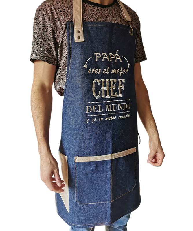 Pechera de Mezclilla mejor chef con aplicaciones de eco cuero en bolsillos y argolla de bronce para colgar el paño, con leyenda grande Bordada. Además Tamaño único.