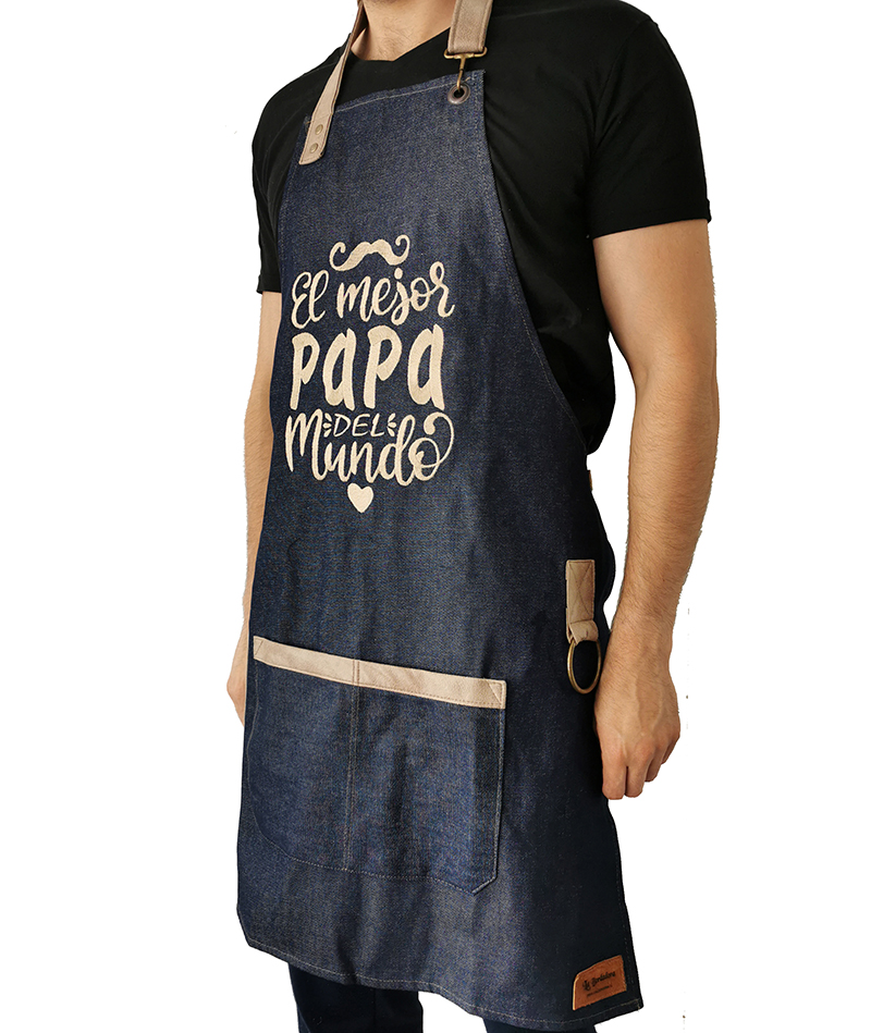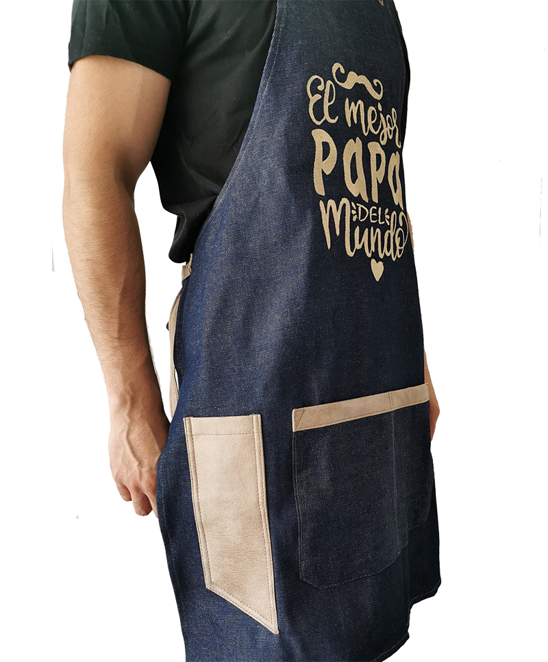 Pechera de mezclilla con aplicaciones de eco cuero en bolsillos y argolla de bronce para colgar el paño, con leyenda grande Bordada. Además Tamaño único.