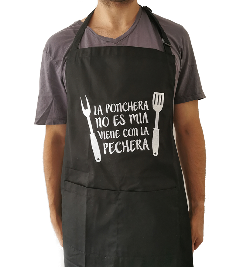 Pechera negra de Gabardina con bolsillo . Además con diseño leyenda Bordada. Tamaño único
