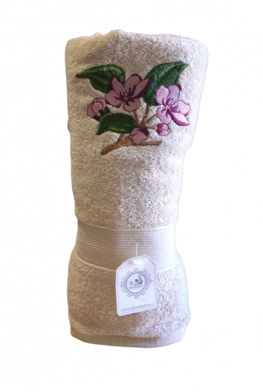 Toalla baño Beige con Diseño Flor de ciruelo bordada. Además Incluye nombre chico bordado. Además regalo ideal para las amantes de las flores. Delicado y hermoso detalle.
