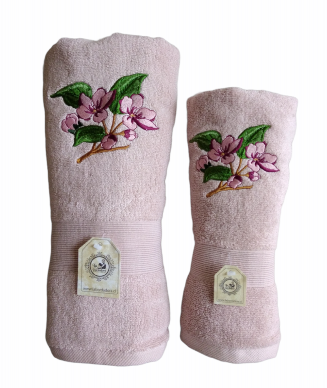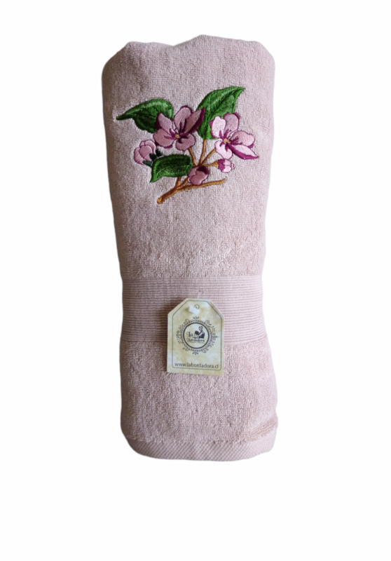 Toalla baño color rosa con flor de ciruelo bordada. Además Incluye nombre chico bordado. Además regalo ideal para las amantes de las flores. Delicado y hermoso detalle.