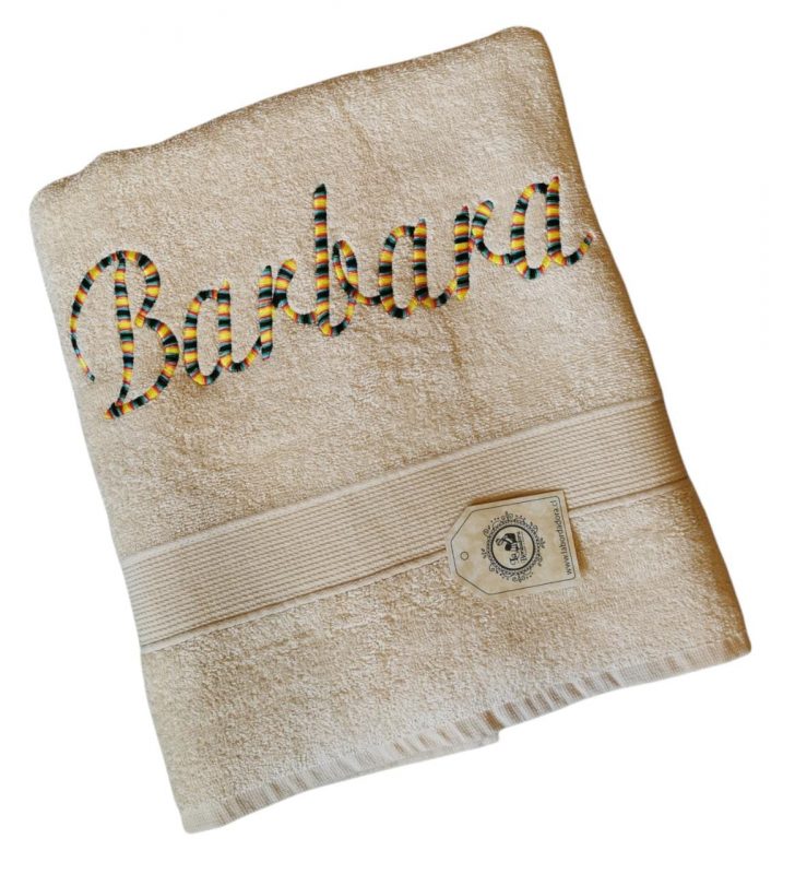 Toalla baño de 70×135 cm con nombre bordado en hilo matizado. Además regalo ideal para los lolos y lolas de la familia.