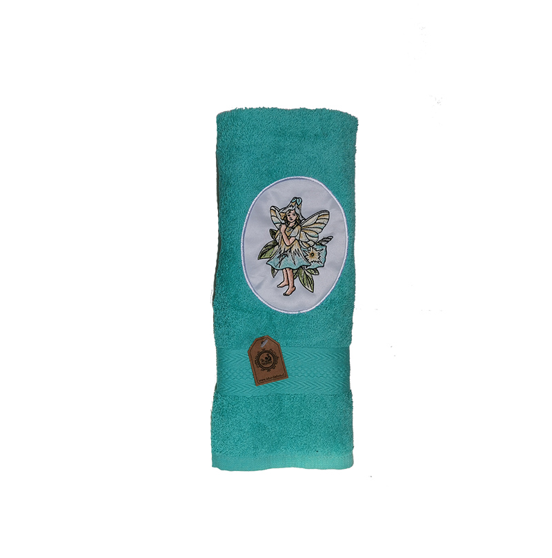 Toalla de mano color turquesa que mide 65 x 45cm. Incluye nombre y diseño de Hada bordado en aplicación de Razo
