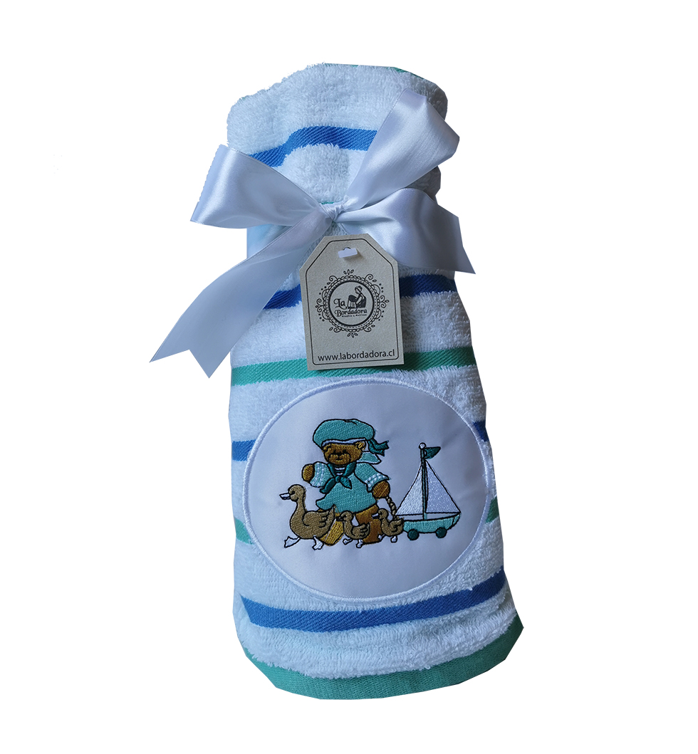 Toalla rayada color 60 x 90 cm aproximado, de algodón . Además con diseño bordado.